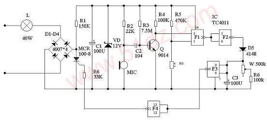 220V的市电经过灯泡和全桥整流后一路加在单向可控硅MCR 100-8上,另一路经R1限流后给本电路供电。由于一开始可控硅无触发信号,呈关断状态,灯不亮。C1为主滤波电容,VD为12V的稳压二极管给本电路提供稳定的工作电压。Q1、R3、R4组成前级电压放大电路,微弱声音信号(话话声,脚步或掌声)由话筒MIC接收并转换成电信号,经C2耦合到Q9014的基极进行电压放大,R2为MIC的供电限流电阻,R3、R4是Q9014的偏置电阻,放大的信号送到与非门(F1)的2脚。光敏电阻RG和R5组成串联分压电路,夜晚环境下无光时,光敏电阻的阻值很大,TC4011 一脚电压为高(反之则低),F1和F2将信号进行两级整形放大。后经D5整流加在F3的输入端及同时给C3充电,很快C3上就充到了门电路的翻转电压, F3输出低电平,F4输出高电平,经R7加在单向可控硅的G极,可控硅导通,灯泡点亮。在这个过程中,声音信号只需一个瞬时即可,这是因为,当声音信号来时,C3上的电压很快就充到了电源电压,而这时即使声音信号消失, C3只能通过W、R6进行放电,所以C3上将维持一段时间的高电平,这个高电平将维持单向可控硅导通,这就是延时的效果,灯亮后所能延时的长短取决于C3上维持高电平的时间长短,所以选择C3、W和R6的组合,可以控制延时的长短。当C3上的电压放到低于1/3电源电压时,F3输出高电平,F4输出低电平,单向可控硅的控制端没了触发信号,当交流电压过零时就被关断,灯熄灭。