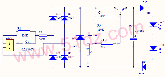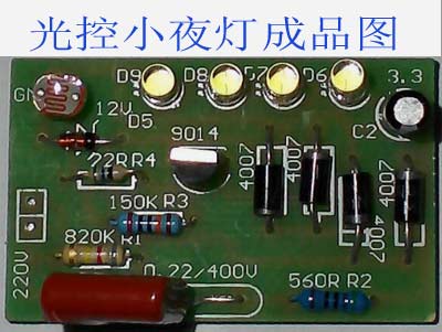 功能:  工作电压:220V,光控LED小夜灯,通过光敏电阻感应环境光线的强弱来控制LED的发光强度,实现白天自动关闭,夜晚自动打开的功能。