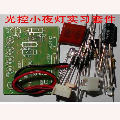 光控小夜灯套件:利用光敏电阻感测环境亮度,天黑了就点亮4个LED发光,产品比传统小夜灯省却开关部分,无须人手控制,发光部分采用LED,在亮度达到传统光管式小夜灯的同时,功耗更低,效果不错,欢迎在家试作。