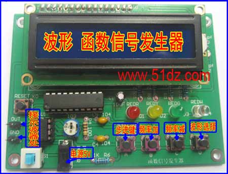 带屏函数信号发生器套件:本套件是利用STC89C52单片机和数模转换器件DAC0832产生所需不同信号的低频信号源,即采用STC89C52 单片机作为控制核心,而在外围采用数字/模拟转换电路(DAC0832)、运放电路(LM358)、按键和LCD液晶显示电路等,通过按键可控制产生方波、锯齿波、三角波、正弦波,同时用LCD液晶显示对应的波形输出。设计过程中主要实现利用按键来控制不同波形的输出,当按键1按下时,函数发生器就切换不同的波形;当按键2按下时,函数发生器就加频率;当按键3按下时,函数发生器就减频率;当按键4按下时,函数发生器就进入调节步进值。