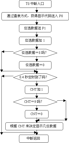 (1. 动态数码显示技术;如何进行动态扫描,由于一次只能让一个数码管显示,因此,要显示8位的数据,必须经过让数码管一个一个轮流显示才可以,同时每个数码管显示的时间大约在1ms到4ms之间,所以为了保证正确显示,我必须每隔1ms,就得刷新一个数码管。而这刷新时间我们采用单片机的定时/计数器T0来控制,每定时1ms对数码管刷新一次,T0采用方式2。
