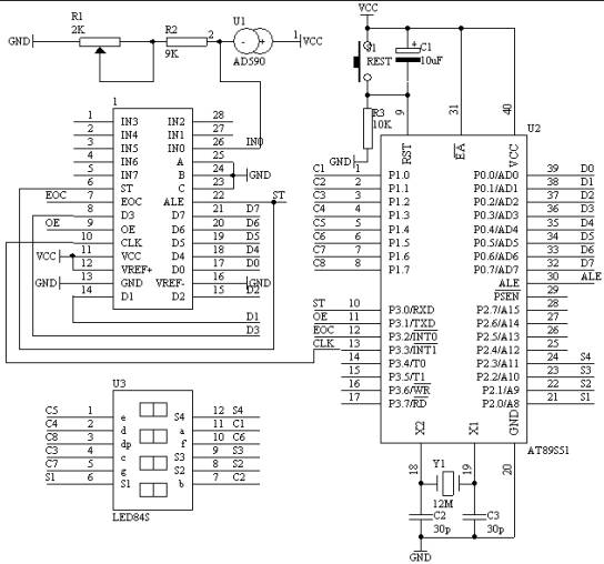 利用AD590温度传感器完成温度的测量,把转换的温度值的模拟量送入ADC0809的其中一个通道进行A/D转换,将转换的结果进行温度值变换之后送入数码管显示。