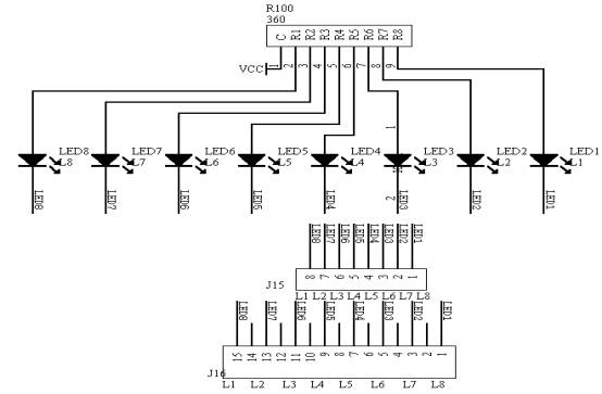 该模块采用8个发光二极管作为指示信号作用,即可以用排线来控制,也可以单个地控制每个发光二极管的亮灭,当控制信号为低电平时,发光二极管亮,为高电平时,发光二极熄灭;控制电平的输入由“L1-L8”输入。电路原理图如图1.13