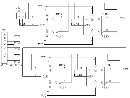 该系统板上的分频电路采用2片74LS74来完成最大16分频,输入的时钟信号由“CK IN”端口输入,经过2片74LS74分频后的信号分别由“/1 /2 /4 /8 /16”端口输出,分别表示未分频,2分频,4分频,8分频,16分频;具体的电路原理图如图1.19所示