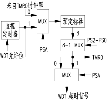 WDT的定时周期在不加分频器的情况下,其基本定时时间是18ms,这个定时时间还受温度、VDD和不同元器件的工艺参数等的影响。如果需要更长的定时周期,还可以通过软件控制OPT/ON寄存器把预分频器配置给WDT,这个预分频器的最大分频比可达到1∶128。这样就可把定时周期扩大128倍,即达到23秒。