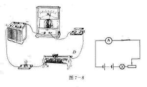 实验先仔细观察滑动变阻器;看向哪方移动滑片是使电阻增大,向哪方移动滑片是使电阻减少然后按图7-8所示连接电路.移动滑片使电阻增大,电流减小,观察电流表的示数变化以及小灯泡的亮度变化,看你做得是否正确,再做一次使电流增大的实验你做对了吗?
