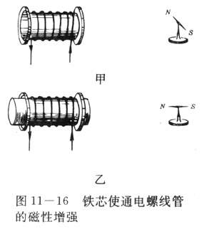 用小磁针探查通用螺线管的磁场,发现当螺线管内播人铁芯时,由于铁志被磁化。磁场大大增强(图11-16)。因此,人们在利用通电螺线管得到强磁场时.一般都要把螺线管紧密地套在一个铁芯上,这样就构成了一个电磁铁。