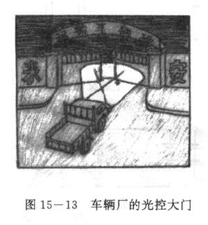 把光敏电阻装在大门上汽车灯光能照到的地方,把带动大门的电动机接在干簧管的电路中,那么夜间汽车开到大门前,灯光照射光敏电阻时,干簧继电器接通电动机电路,电动机带动大门打开(图15-13)