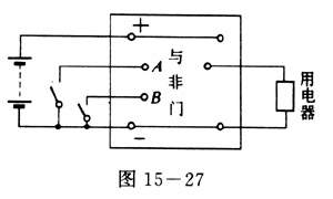 图15-27是应用与非门的基本电路,只要输入端有一个开关低电位间接通,输出端就是高电位,用电器开始工作。